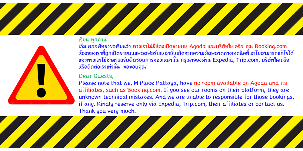 Pattaya is known as the Capital City of ASEAN Tourism. So, after you enjoy your long days with various kinds of tourist attractions and would like to recharge yourself with relaxing and quiet sleep, M PLACE is the answer. We are located in Central Pattaya, near big shopping centers, food outlets and very easy to travel around.